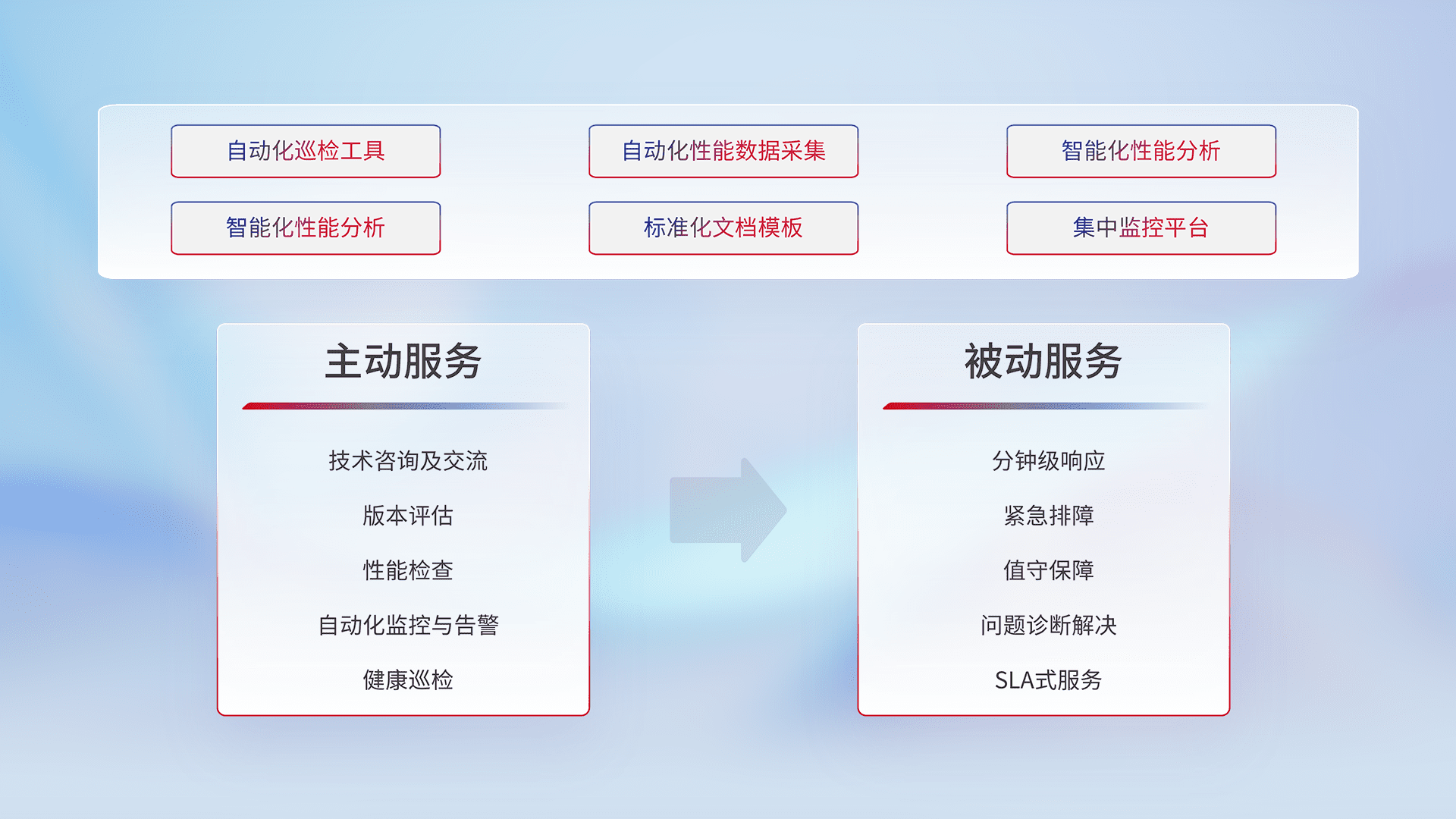 智能化工具和标准化文档,,,保障服务质量,,,,提供主动服务(包含技术咨询、、、、版本评估、、、性能检查、、、自动化监控与告警、、健康巡检)和被动服务包含(分钟级响应、、、、紧急排障、、、值守保障、、问题诊断解决、、、SLA服务)。。。
