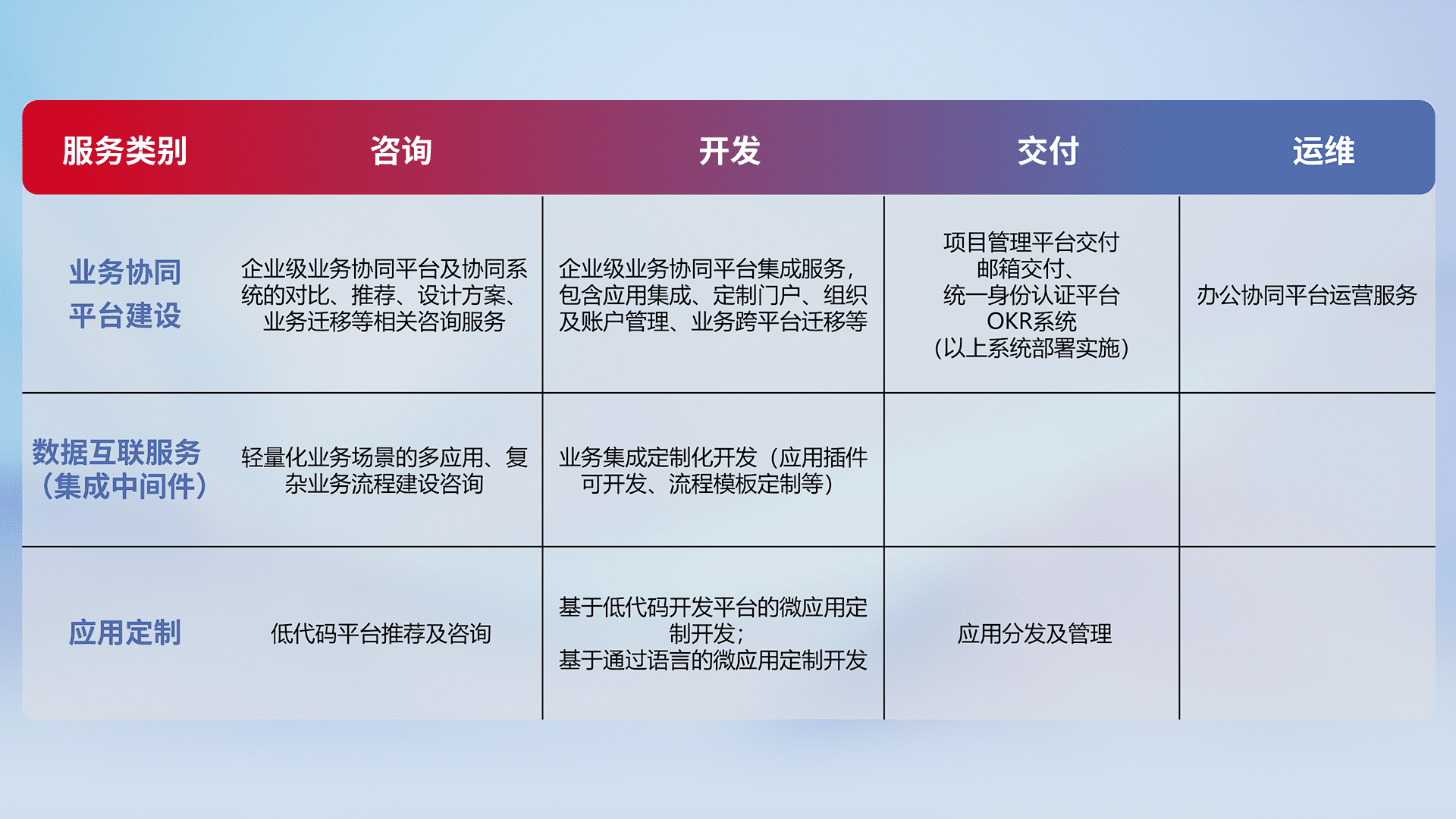 针对钉钉、、、企微、、IDaas等平台级产品提供产品的规划、、、方案、、、交付、、、定制化开发等服务,,实现如统一协同办公、、智能客户服务、、、混合会议管理、、智能数据查询、、、等业务场景,,,,实现数字化转型。。。